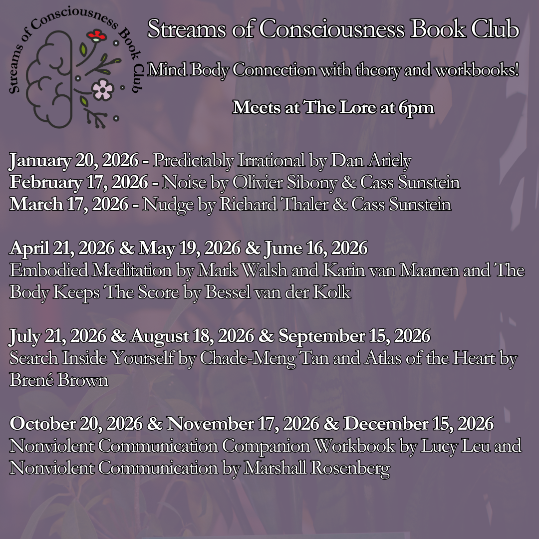 This is a non-fiction book club dedicated to understanding and skillfully working with our three streams of consciousness. Namely, our senses, emotions, and thoughts. Our ultimate goals are to increase well-being and develop better connections with ourselves and others. We take a slower pace as we're aiming at personal learning, practice, and transformation. Often there is a workbook accompanied by a textbook. This in-person book club is held at The Lore, in Norman, Oklahoma. See our monthly dates and book titles in this image. You can also order most of our books through The Lore's shopping page.